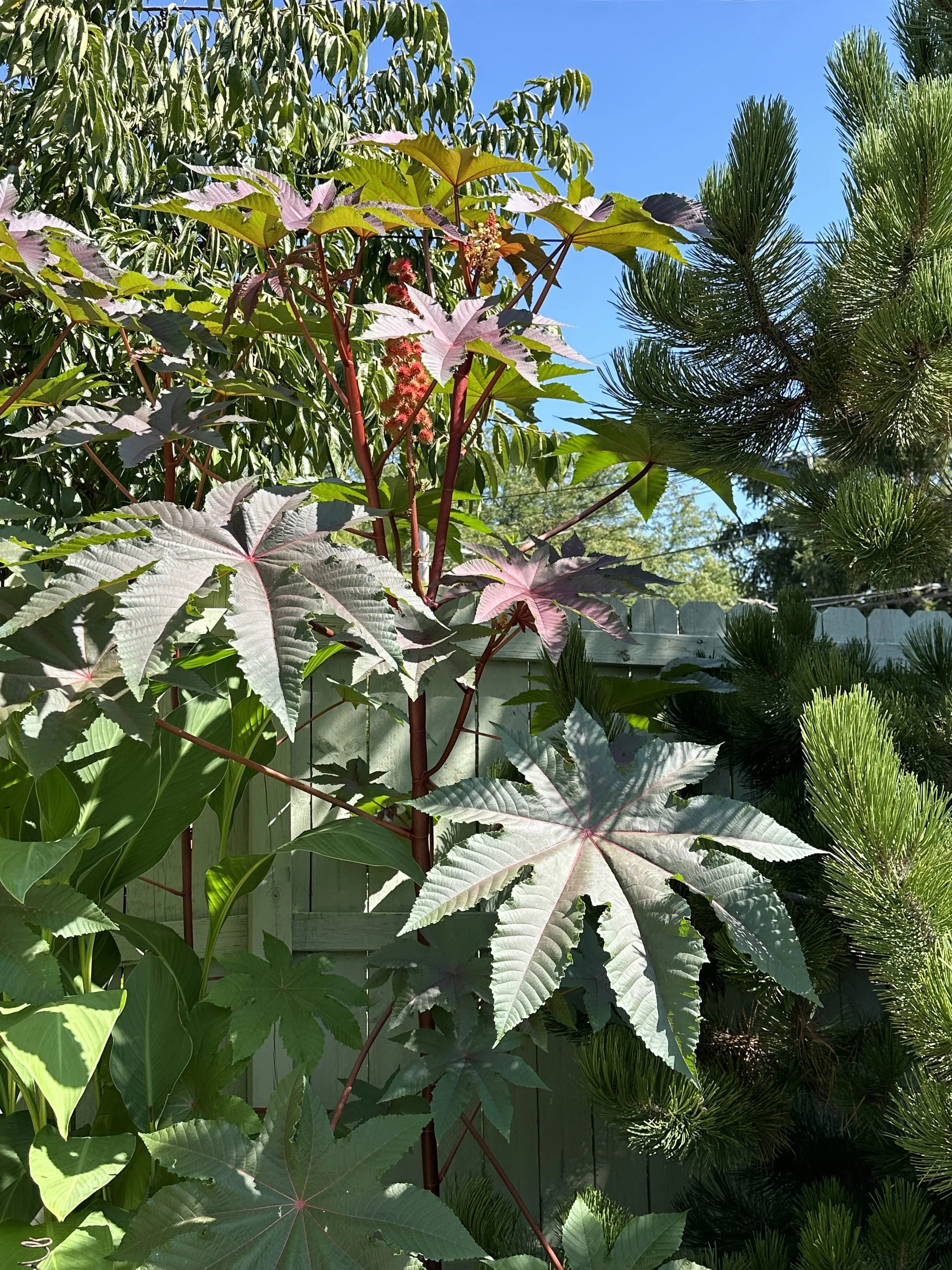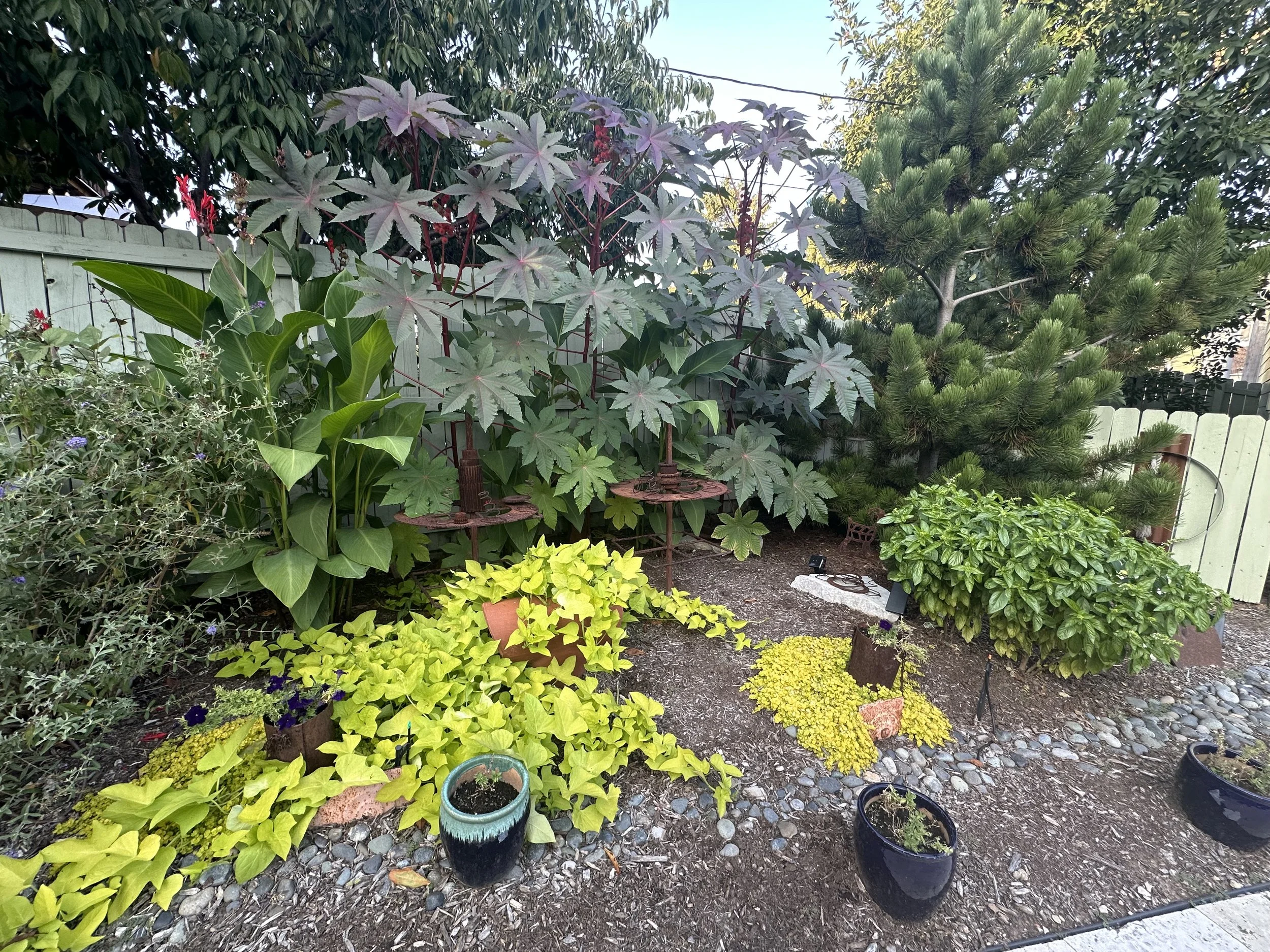 Crazy big ten foot tall castor beans outgrew the canas. Butterfly bush, sweet potato vine, yellow creeping jenny, Bosnian pine, river of rocks and rusty rebar things with rusty circles on them
