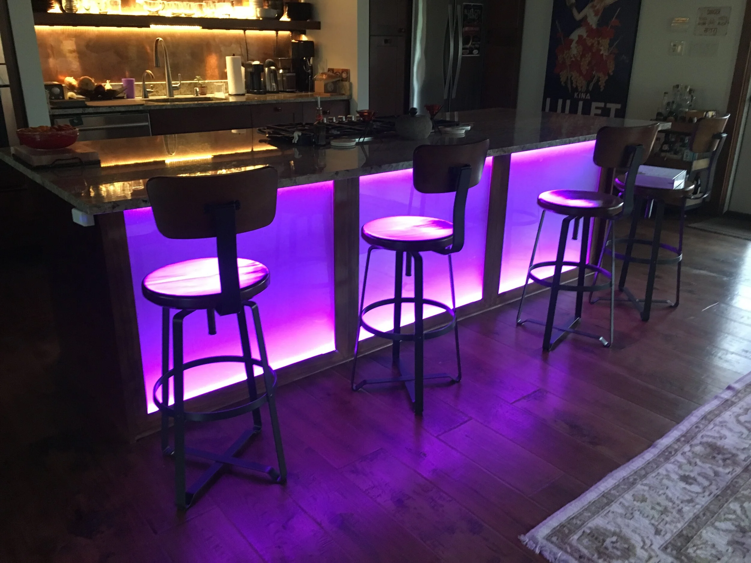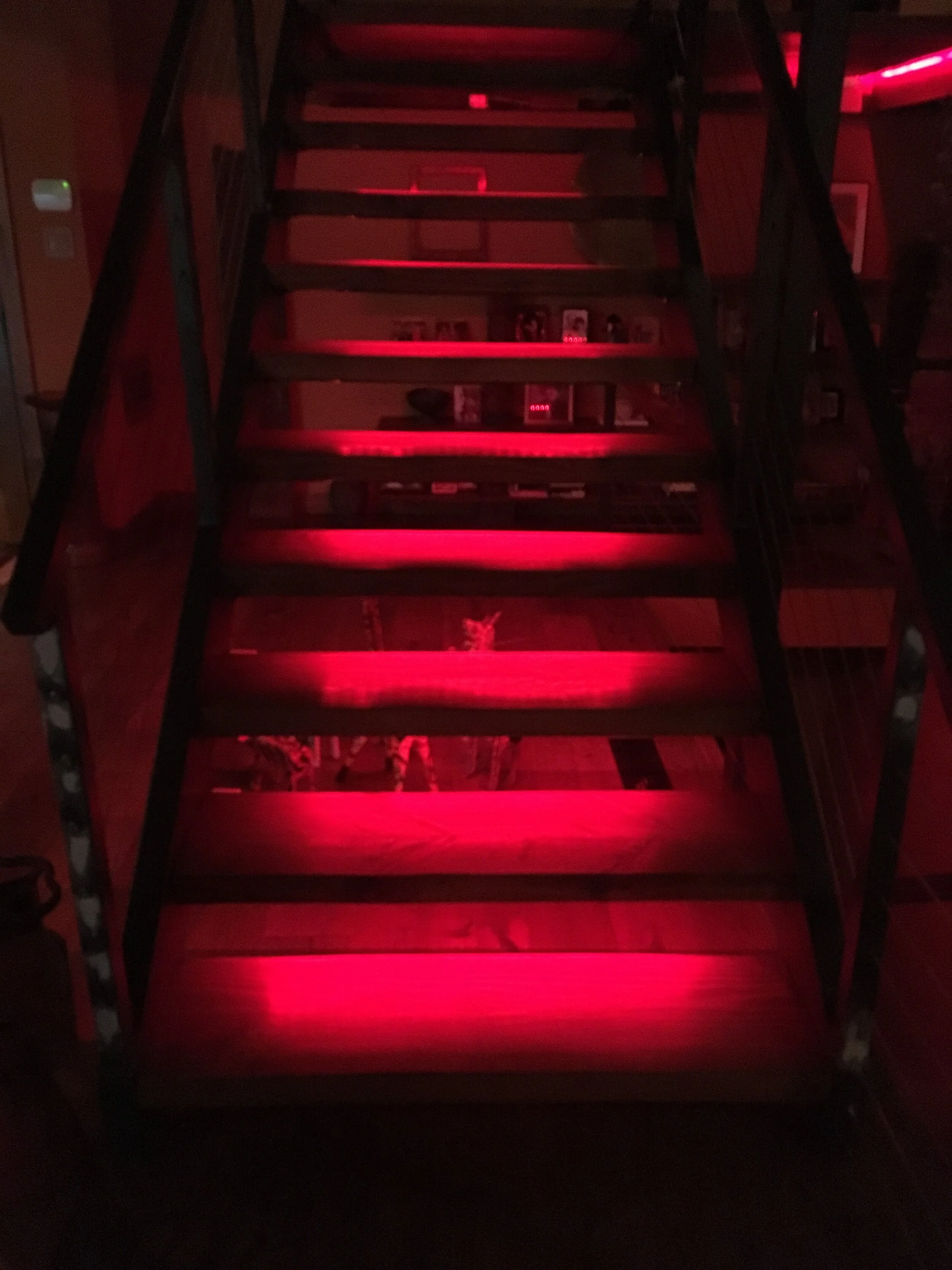 This was done using strip multicolor LED lights under each step. Color of the day?