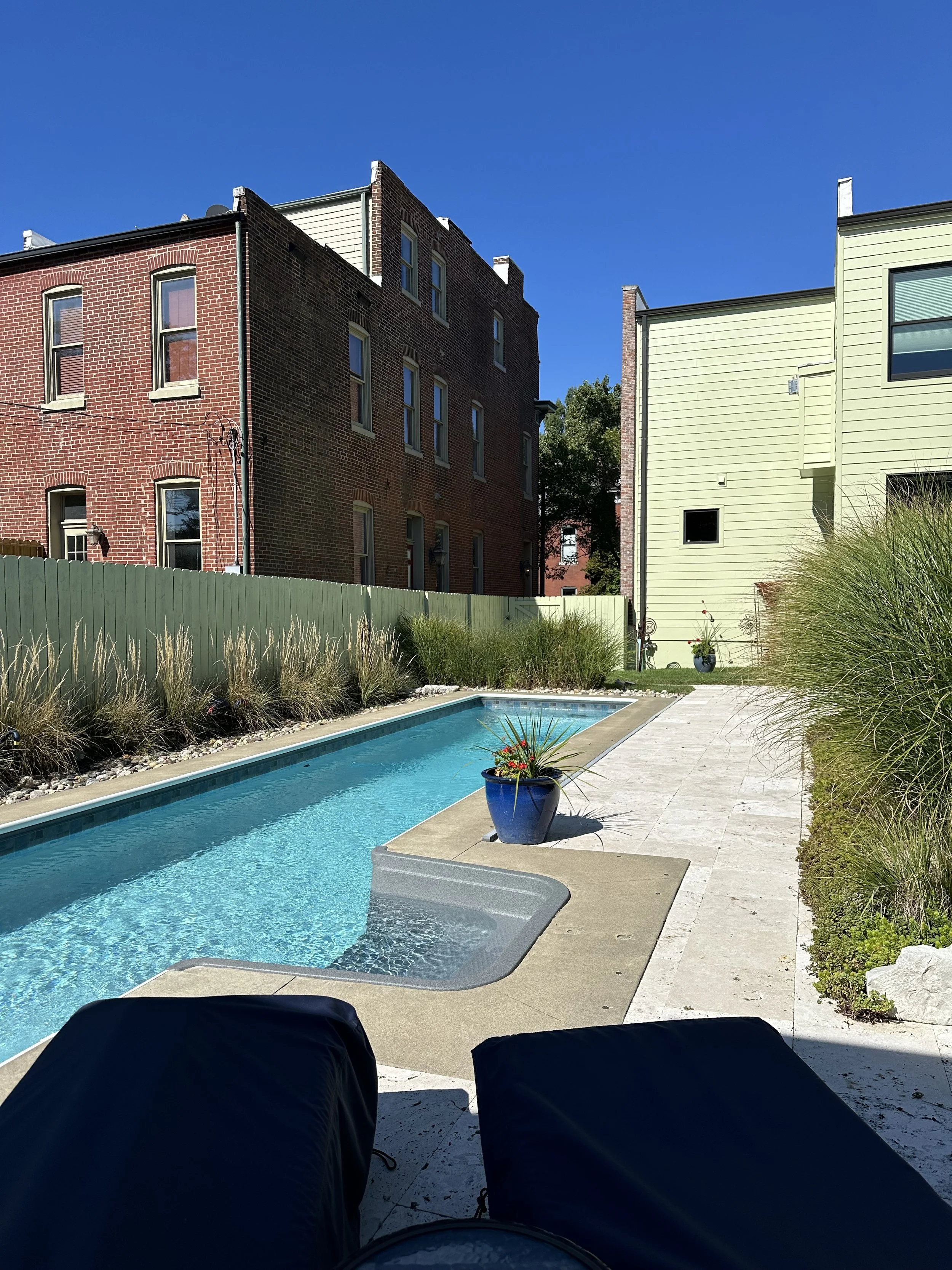 Calamagrostis Karl Foerster Feather grasses along the fence by the pool and miscanthus tall grasses along the yard and at the pool's end make the pool deck its own little grotto