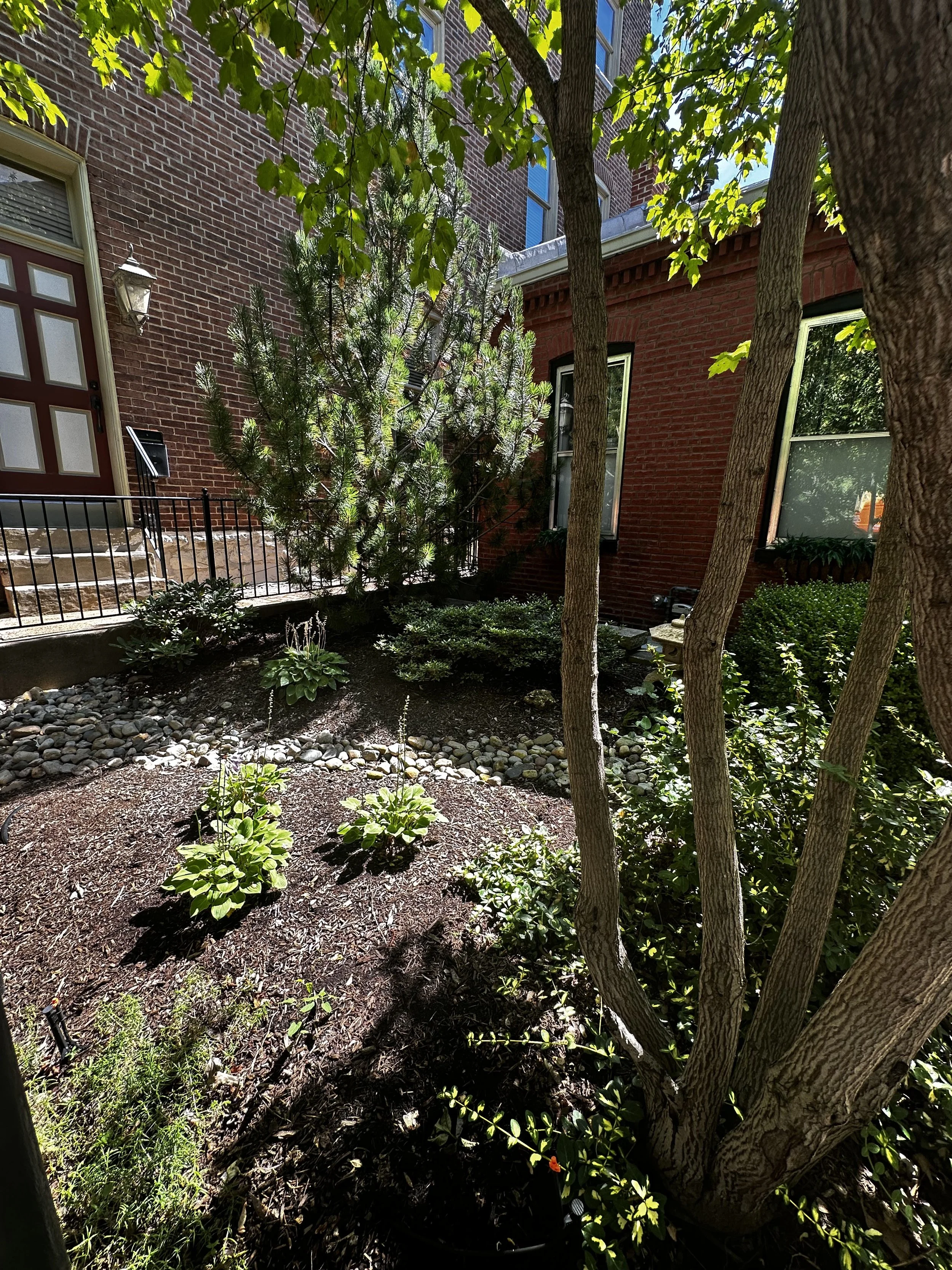 Landscaping in front of rental property. Asur birch, rhododendrons, azelias, boxwoods, creeping euonymus, purple sedum,